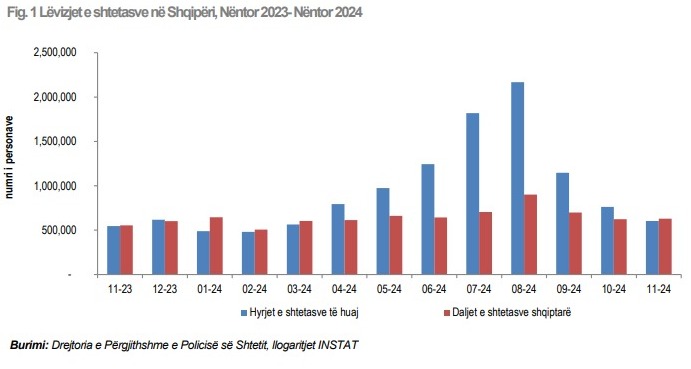 Vetëm në nëntor 2024, në Shqipëri hynë 1.26 mln shtetas, me rritje 15% nga një vit më parë. 660 mijë prej tyre ishin shtetas shqiptarë, me rritje rreth 20% dhe pjesa tjetër të huaj me rritje 10.4%.