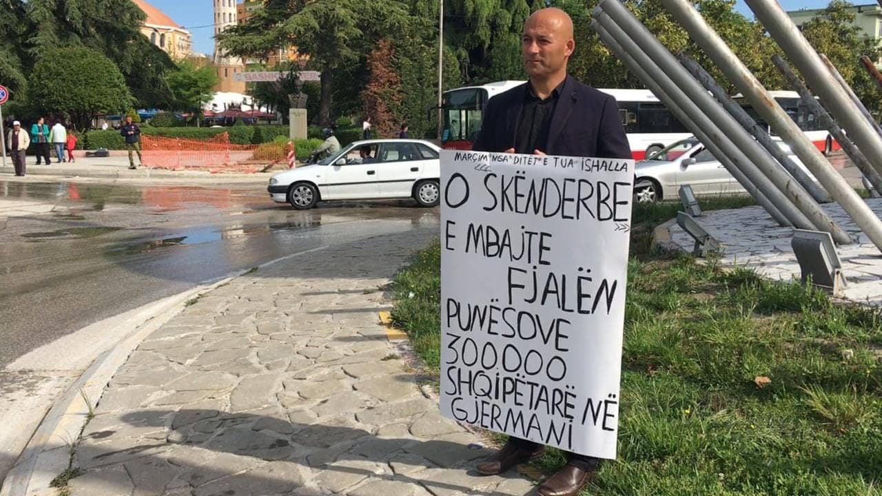 Në pankartën që ai mbante në dorë shkruhej: “O Skënderbe e mbajte fjalën, punësove 300. 000 shqiptarë në Gjermani”, duke ironizuar premtimin e kryeministrit Rama.