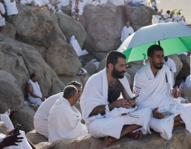 Pelegrinët të veshur me rroba të bardha u ngjitën në malin shkëmbor të Mëshirës, i cili ndodhet në fushën e Arafatit ku Profeti Muhamed mbajti predikimin e tij të fundit.
