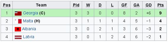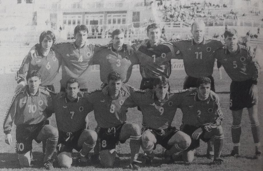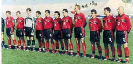 Kombëtarja në ndeshjen me Gjeorgjinë 0-3. Ne foto lart nga e majta: Kotrri, Fakaj, Shulku, Beqaj, Tare, Vata. Ulur nga e majta: Rraklli, Peco, Bushi, Kola, Lala