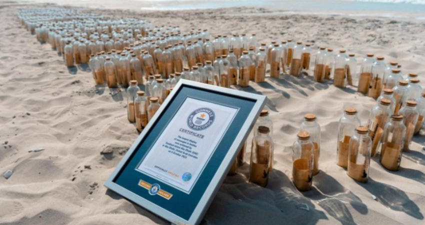 Një ishull në Emiratet e Bashkuara Arabe theu një rekord botëror Guinness me mesazhet e krijuara me 1100 shishe.