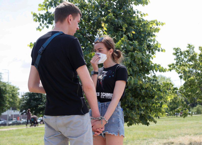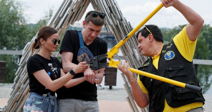 Çifti ukrainas Alexandr Kudlay and Viktoria Pustovitova vendosën të shprangosen pas 123 ditëve të prangosur me njëri-tjetrin.