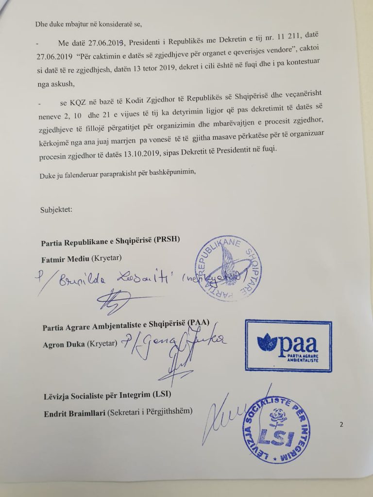 Letra e tre partive politike LSI, PAA dhe PR drejtuar KQZ-së për regjistrimin në zgjedhjet lokale të 13 tetorit, duke kërkuar zbatimin e dekretit të Presidentit
