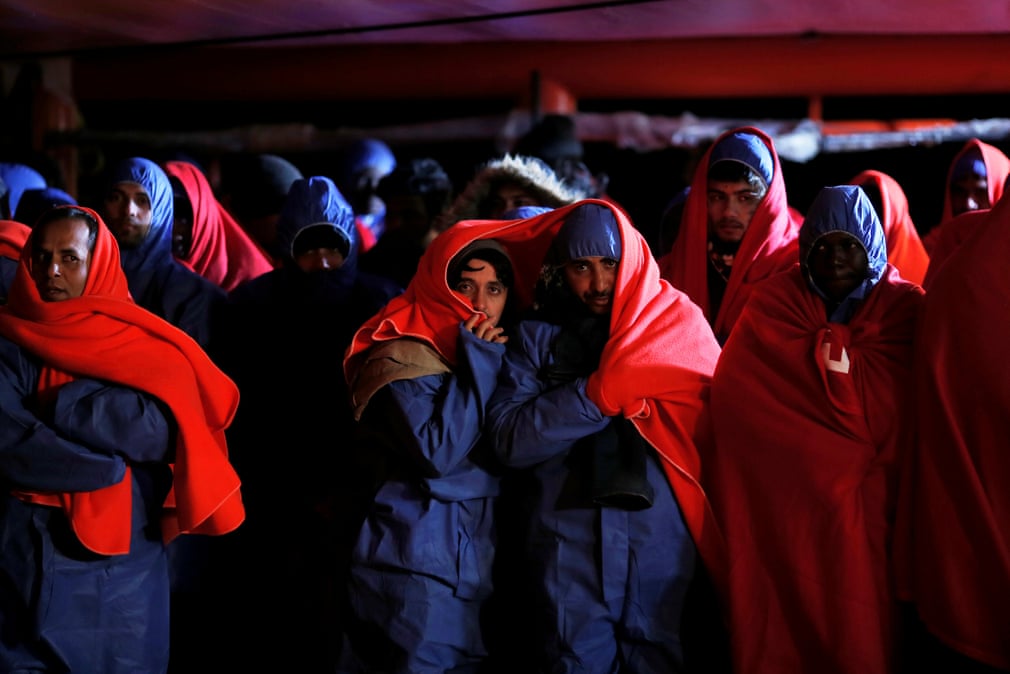 Emigrantët të ndaluar në Mesdhe, presin të zbarkohen nga një varkë shpëtimi. Fotografia: Jon Nazca/Reuters.