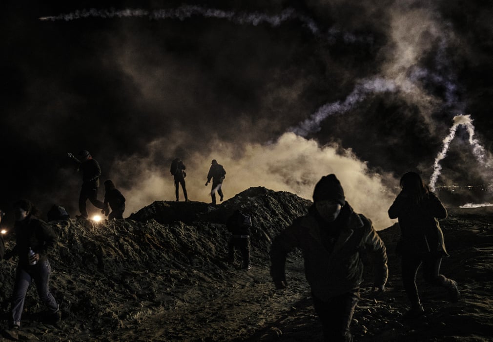 Emigrantët arratisen nga gazet lotsjellës të hedhur nga rojet kufitare amerikane, pasi u ngjiten gardheve nga Meksika. Fotografia: Daniel Ochoa de Olza/AP