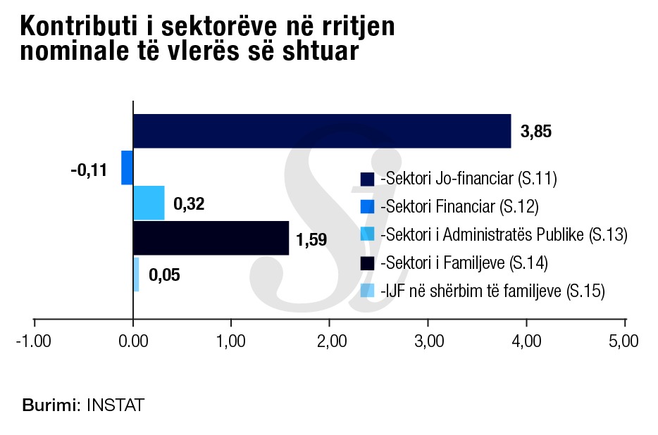 Kontributin më të lartë në këtë rritje e ka dhënë Sektori i Jo-Financiar me 3.85 pikë përqindje, ndërsa kontributin më të ulët e ka dhënë Sektori Financiar me -0.11 pikë përqindje. .