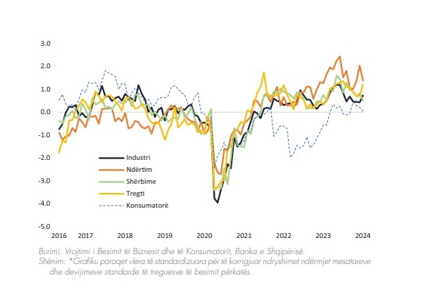 Nga ana tjetër, tregtia dhe industria raportohen me rritje 4.9 dhe 4 p.p respektivisht, pasi presin rritje të kërkesës dhe punësimit. Të dy sektorët parashikojnë rënie çmimesh.