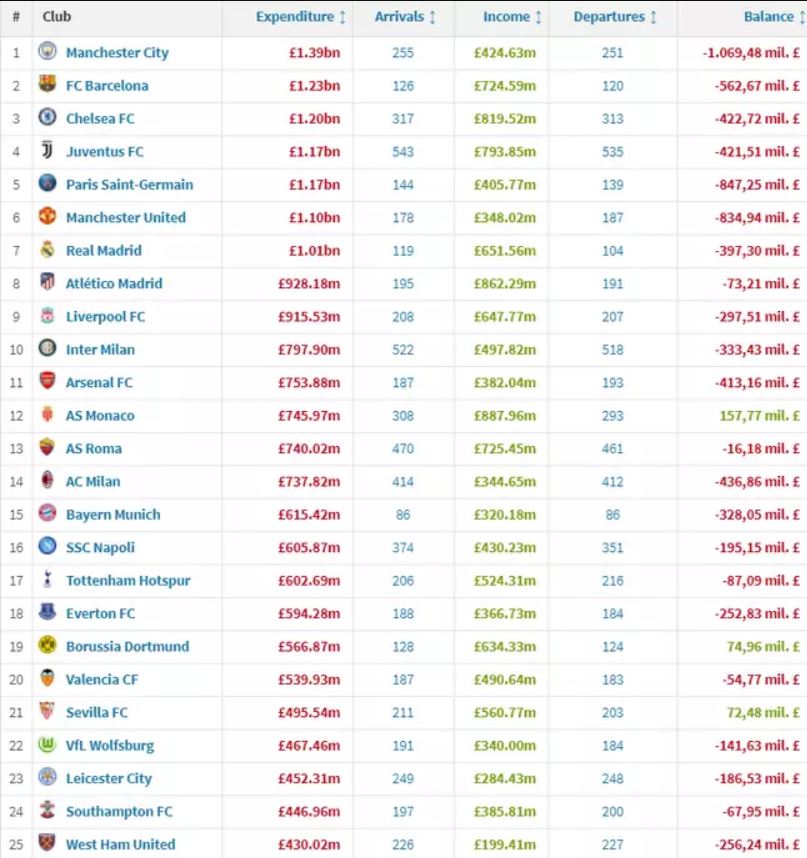 Manchester City ka shpenzuar më shumë para për transferime se çdo klub futbolli përgjatë 10 viteve të fundit, duke shpenzuar mbi 1 miliard Pound për lojtarët e rinj përgjatë kësaj dekade. Pak para fillimit të dekadës, Real Madrid theu dy herë rekordin e transferimit në një verë, duke shpenzuar 56 milion paund për Kaka dhe më pas 80 milion paund për Cristiano Ronaldon. 10 vite më pas, këto shifra janë bërë pothuajse të zakonshme dhe rekordi tani arrin në 198 milion paund, për Neymar.