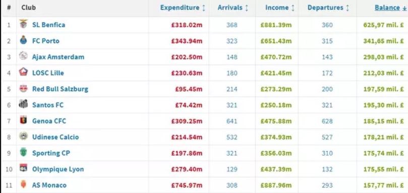 Real Madrid ka dominuar në kontinent, duke u shpallur kampion në katër raste, duke përfshirë tri vite rresht, dhe ky klub është vetëm në vendin e shtatë në listën e klubeve me shpenzimet më të larta. Vetëm tre klube të renditura në 25 vendet e para arritën të dilnin me fitim në 10 vitet e fundit , ku Monaco, Borussia Dortmund dhe Sevilla kanë arritur të menaxhonin financat e tyre jashtëzakonisht mirë. Ajo që është më mbresëlënëse për këto klubet është se ato kanë arritur të jenë gjithashtu të suksesshme. Monaco ndaloi mbizotërimin e PSG në Francë, dhe arriti në një gjysmëfinale të Ligës së Kampionëve, Dortmund bëri të njëjtën gjë në Gjermani me dy tituj të fituar kundër Bayern Munich, dhe humbi kundër rivalëve të tyre në finalen evropiane, dhe Sevilla fitoi tre herë Europa League. Monaco është klubi i futbollit me shpenzimet neto më të larta, ndër tre klubet e mësipërme, duke u pozicionuar në vendin e 11, me Benefica që pozicionohet në vendin e parë, me një bilanc pozitiv prej 626 milion paund.