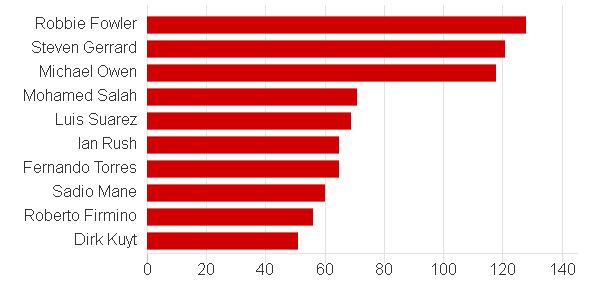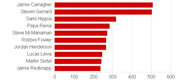 Që nga fillimi i sezonit 1990-91, Liverpool ka aktivizuar 239 futbollistë, ku lojtari që ka luajtur më shumë ndeshje me “Reds” është Jamie Carragher, 508 ndeshje dhe pas tij vjen Steven Gerrard. Në Top 10 renditet edhe kapiteni aktual, Jordan Hendreson, me 266 ndeshje.
