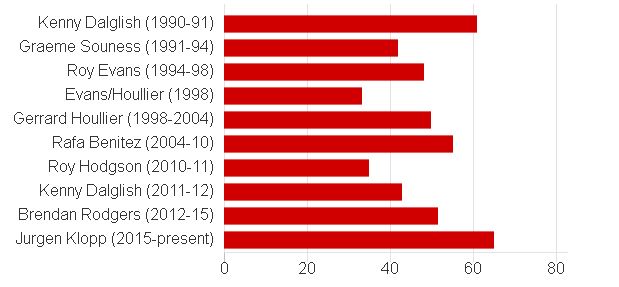 Liverpool ka luajtur 1,149 ndeshje që nga fillimi i sezonit 1990-1991.Janë 103,410 minuta lojë të harxhuar në fushë në ndjekje të titullit të 19-të. “Reds” kanë fituar 595 nga këto ndeshje (52%), kanë shënuar 1.968 gola (golavarazhi është +822) duke grumbulluar 2,075 pikë. Numri më i madh i pikëve që ata kanë grumbulluar nga një kundërshtar i vetëm gjatë këtyre  tre dekadave janë 108 pikët ndaj Tottenham, në 60 takime mes tyre.