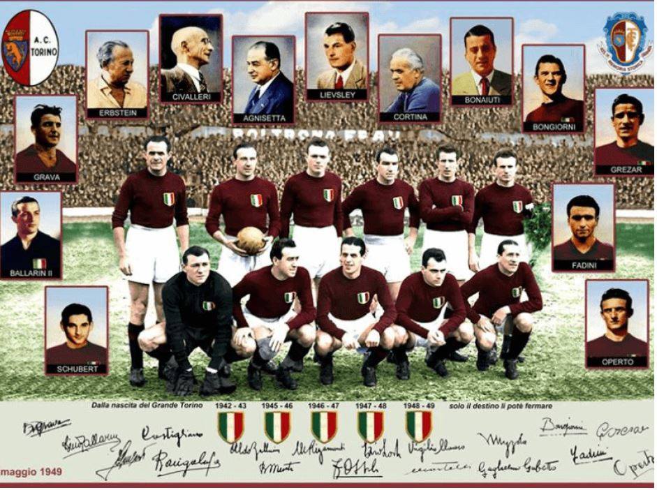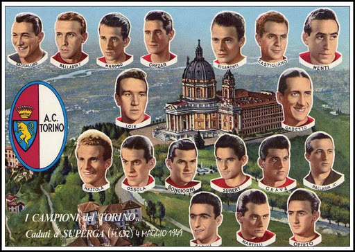 Castigliano, Rigamonti dhe Grezar; Menti, Gabetto, Loiku, Mazzola dhe Ossola; Rezervat:Fadini, Bongiorni, Schubert, Operto, Grava dhe Martelli ; të dy trajnerët Erbstein dhe Livesley, masazhatori dhe tre menaxherët; Cavallero dhe dy kolegë të tjerë; katër burrat e ekuipazhit. Dhe në mesin e tyre piloti i parë, Pierluigi Meroni. Kanë kaluar vite dhe Torino nuk ka patur më një ekip që i përafrohet këtij ekipi që u shua.