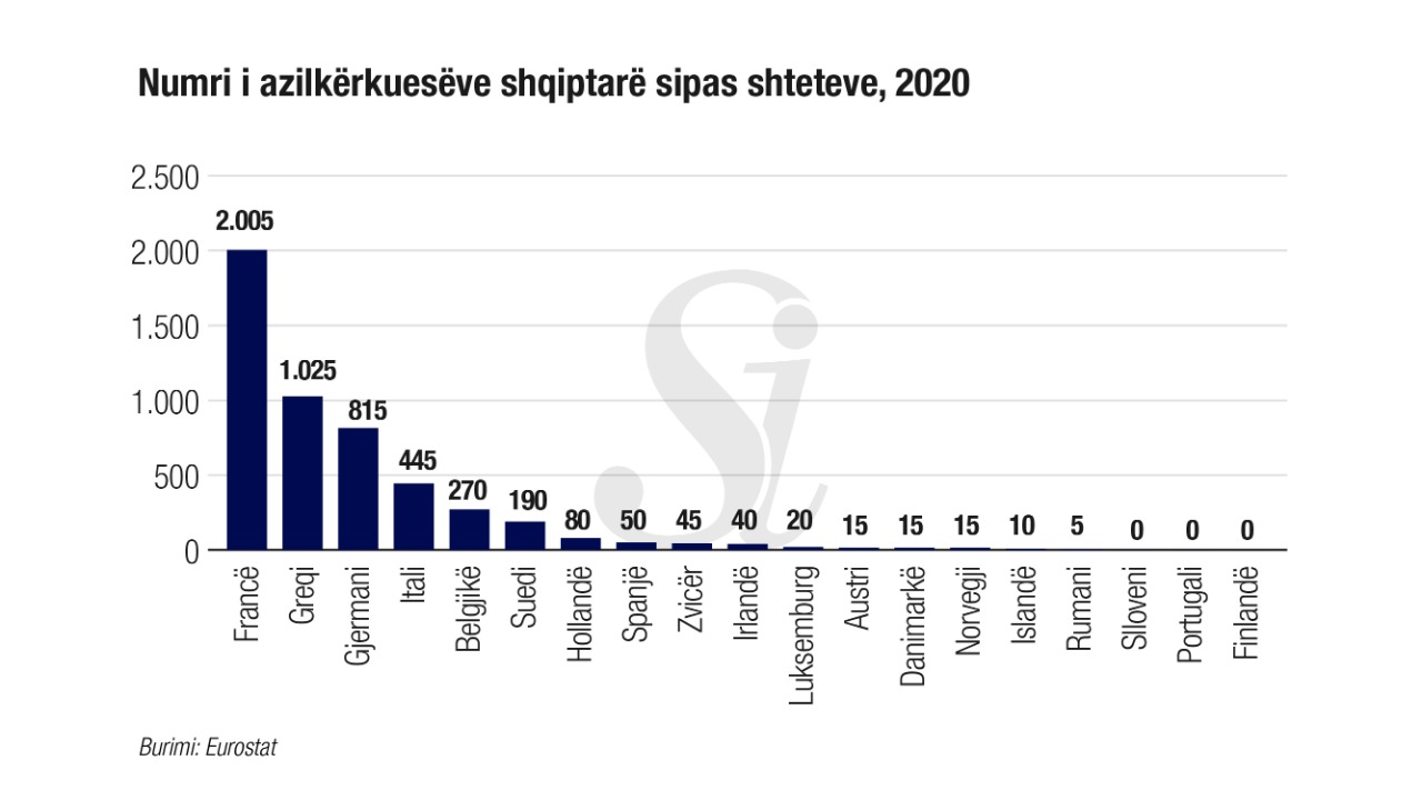 Kërkesa për azil nga refugjatët shqiptarë vazhdon të rritet duke arritur 5.000 aplikime gjatë 12 muajve të fundit. Sipas Eurostat, shteti i preferuar i shqiptarëve është Franca për disa vite me radhë tashmë me rreth 43% të aplikantëve, ndjekur nga Greqia me 17% dhe Gjermania me 12%.
