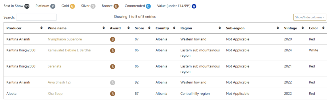 Në ndarjen e çmimeve të vitit 2025, u dhanë 50 medalje “Best in Show” (që përfaqësojnë vetëm 0.30% të të gjitha verërave të degustuara), së bashku me 137 medalje Platini dhe 732 medalje ari, të dyja një rritje krahasuar me vitin e kaluar.