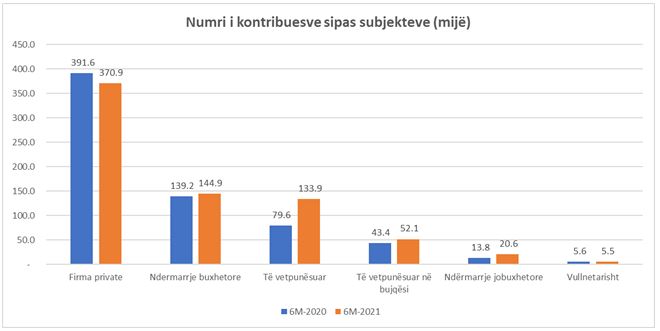 Por punësimi në sektorin privat nuk pati të njëjtën tendencë.Numri i kontribuuesve në firmat private ishte 370,882 persona në 6-mujorin e parë,  20.751 persona më pak, duke u ulur me 5.3% në krahasim me të njëjtën periudhë të vitit 2020,kur vendi ishte në kulmin e pandemisë.