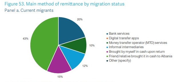 Sipas gjetjeve të raportit, rreth 60% e diasporës shqiptare sjell para në Shqipëri përmes familjarëve, miqve ose duke i transportuar vetë gjatë kthimeve në atdhe. Vetëm 20% e emigrantëve zgjedhin shërbimet bankare, ndërsa 10% përdorin operatorë të transferimit të parave. Kanalet formale financiare, si bankat dhe operatorët e transferimit të parave, mbeten të nënshfrytëzuara, veçanërisht nga migrantët e kthyer, ndërkohë që aplikacionet digjitale nuk përdoren pothuajse fare nga asnjë grup.
