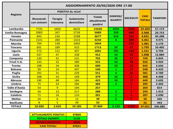 Në Itali, që nga fillimi i epidemisë së Koronavirus, 47.021 persona kanë kontraktuar virusin Sars-CoV-2 (krahasuar me dje ata janë 5,986 më shumë për një rritje prej 14.6%). Ndërsa numri i viktimave ka shkuar në 4032 ku në 24 orët e fundit janë shënuar 627 viktima.