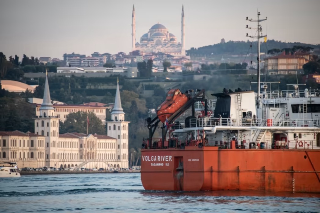 Një cisternë nafte me flamur rus kalon nëpër ngushticën e Bosforit pranë Stambollit. Një plan kufiri i çmimeve të BE-së dhe Mbretërisë së Bashkuar synon të sigurojë që nafta ruse të blihet me një çmim të caktuar në kryeqytetet perëndimore