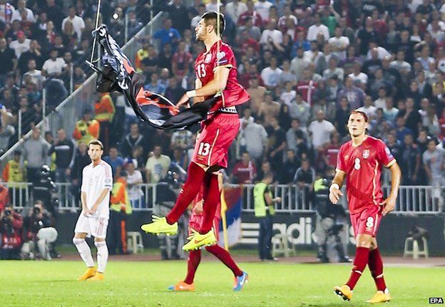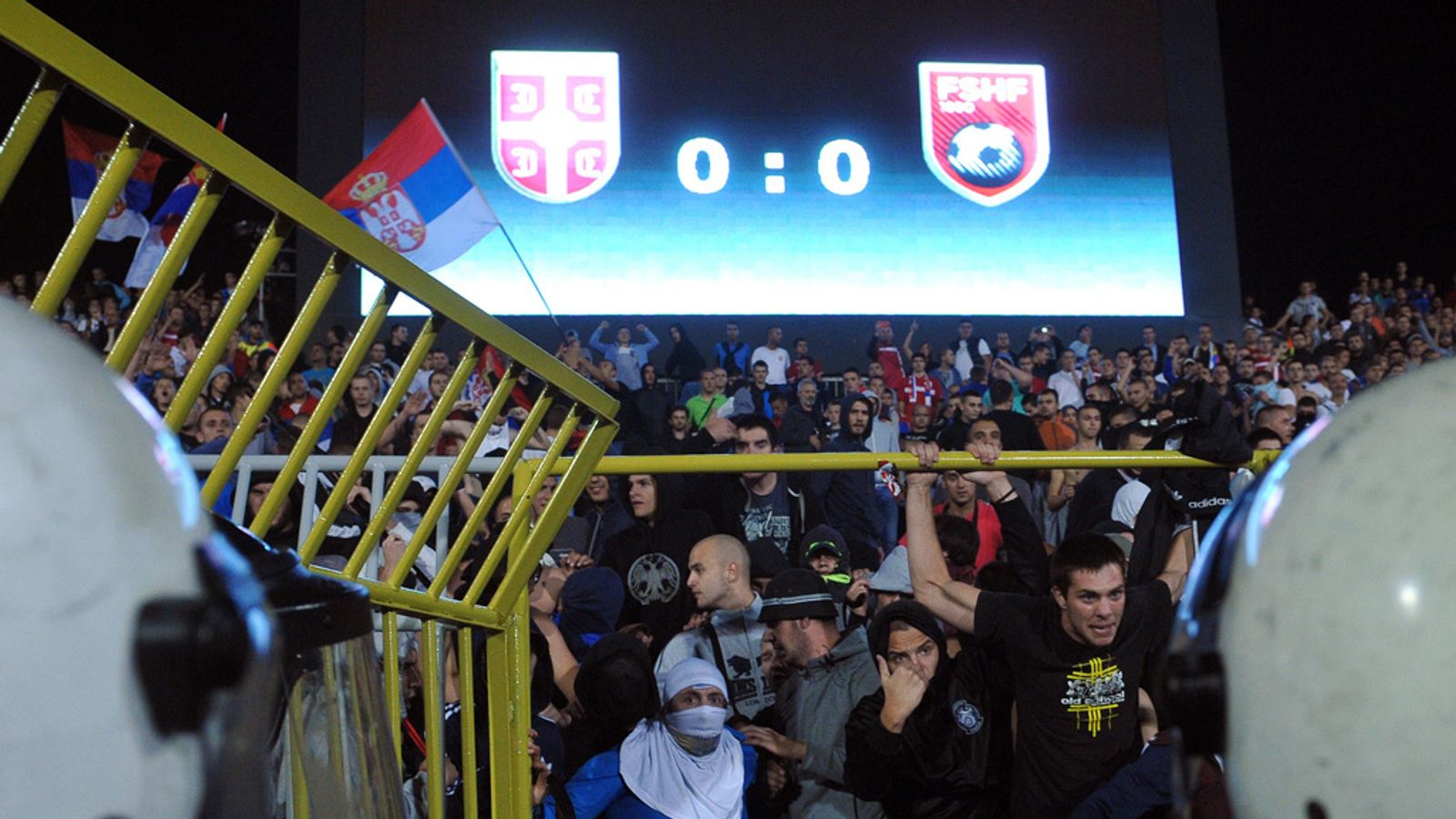 Ishte minuta e 40-të (0-0), kur ndeshja u ndërpre nga arbitri anglez Martin Atkinson. Mbi fushën e stadiumit fluturoi një dron me një flamur kuqezi, ku ishte shkruar “Autochthonous”, që simbolizonte Shqipërinë e madhe. Kaq mjaftoi për të tërbuar serbët.
