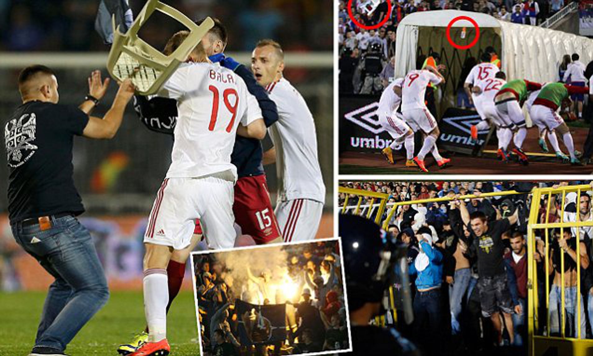 Disa lojtarë të Serbisë vrapuan për të kapur dronin dhe për të hequr flamurin, kurse lojtarët shqiptarë, Balaj, Lila dhe Cana më aktivët, e mbrojtën atë. Më pas në fushë u futën tifozët serbë dhe u bë një kaos i vërtetë. Ekipi ynë mezi mundi të futet në dhomat e zhveshjes.