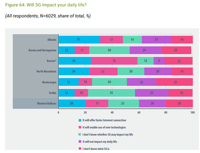Në rajon, vendet e tjera përgjithësisht nuk presin ndikim të madh të 5G-së në jetët e tyre. Ndryshim presin 14% e qytetarëve të anketuar në Bosnjë Hercegovinë, 24% e atyre në Kosovë dhe Maqedoni të Veriut. 15% e të anketuarëve në Mal të Zi dhe 12% e të anketuarëve në Serbi.
