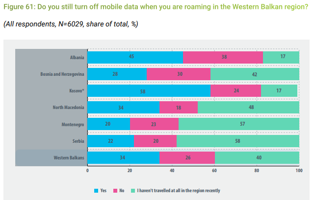 Ndërkohë, 45% e shqiptarëve që janë pyetur nga RCC vazhdojnë të fikin lidhjen e internetit celular (mobile data) sa herë lëvizin në vendet brenda rajonit edhe pse me Roaming kjo nuk duhet të ndodhë. Kjo ndodh edhe me qytetarët e vendeve fqinje. 28% e të pyeturëve nga Bosnjë Hercegovina vazhdojnë të mos përdorin mobile data pasi dalin nga shteti i tyre. Këtë e bëjnë edhe 58% e qytetarëve nga Kosova, 34% e atyre nga Maqedonia e Veriut, 20% e qytetarëve nga Mali i Zi dhe 20% atyre në Serbi.