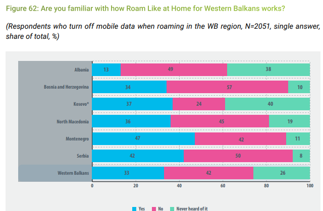 Qytetarët e anketuar nga pesë vendet e tjera të Ballkanit Perëndimor janë më shumë të informuar mbi mënyrën se si funksionon Roaming në rajon. 34% e qytetarve të anketuar në Bosnjë, 37% e atyre në Kosovë, 36% në Maqedoninë e Veriut, 475 në Mal të Zi dhe 42% në Serbi.