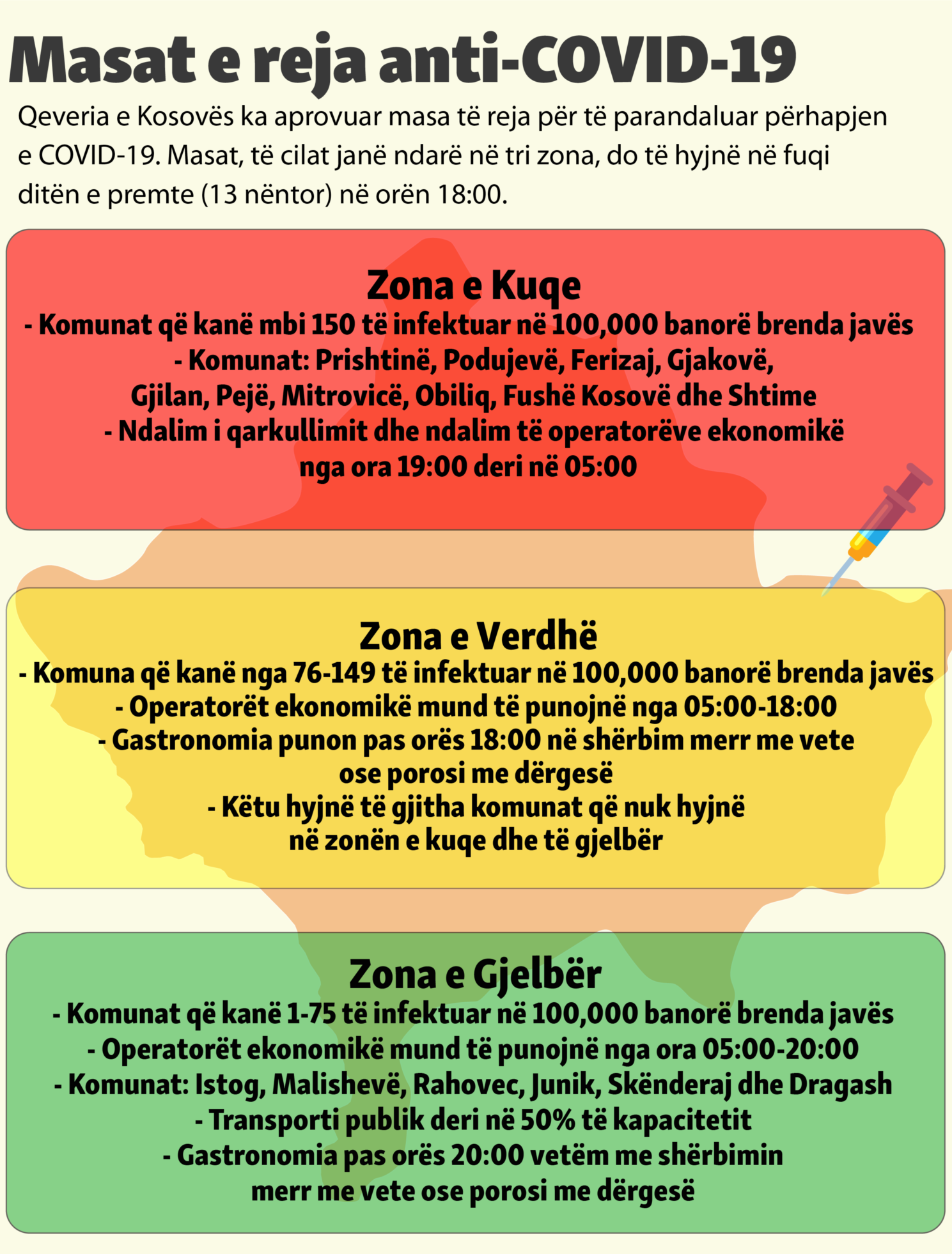 Masat e marra parashohin tri zona të rrezikshmërisë, sipas numrit të të infektuarve nëpër komuna: zona e kuqe me rrezikshmëri të lartë, zona e verdhë me rrezikshmëri mesatare dhe zona e gjelbër e cila ka rrezikshmërinë më të ulët. /REL
