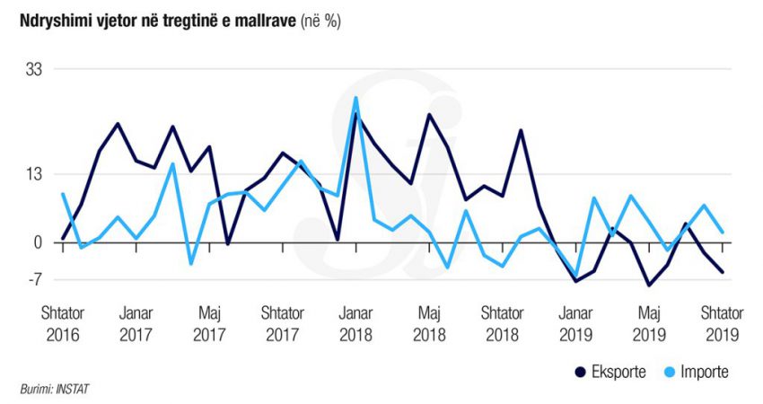 Instat ka raportuar se edhe në muajin Shtator eksportet e mallrave u ulën në krahasim me të njëjtën periudhë të një viti më parë. Eksportet arritën vlerën 25 mld lekë, duke u ulur me 5,5 %, në krahasim me shtatorin 2018.
