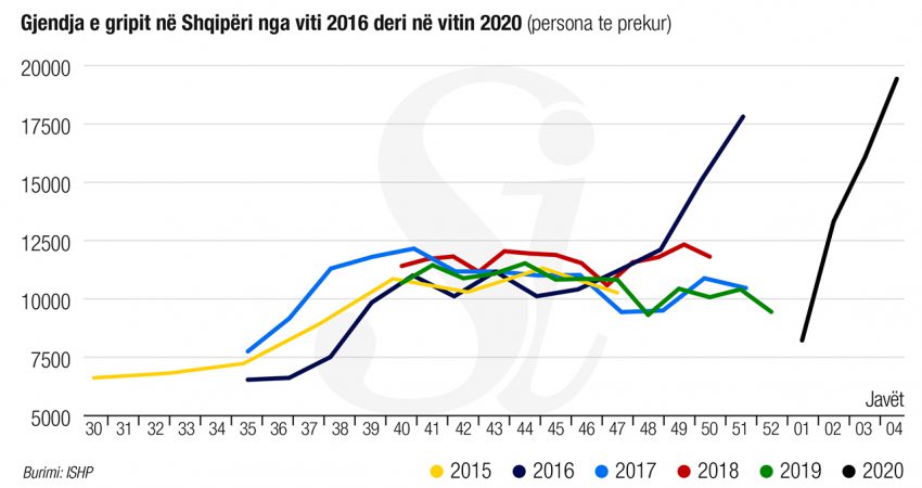 Në vitin 2016 kishte më shumë shqiptarë të prekur nga gripi se të paktën që nga 2015 deri në 2019. Kulmi i është në javën e 52 të 2016 kur numri i të prekurve arriti në 17811 vetë. Por, 2020 shënon rekord tronditës. Të prekurit nga gripi nisin me një numër të madh që në javët e para të fillimit të vitit.