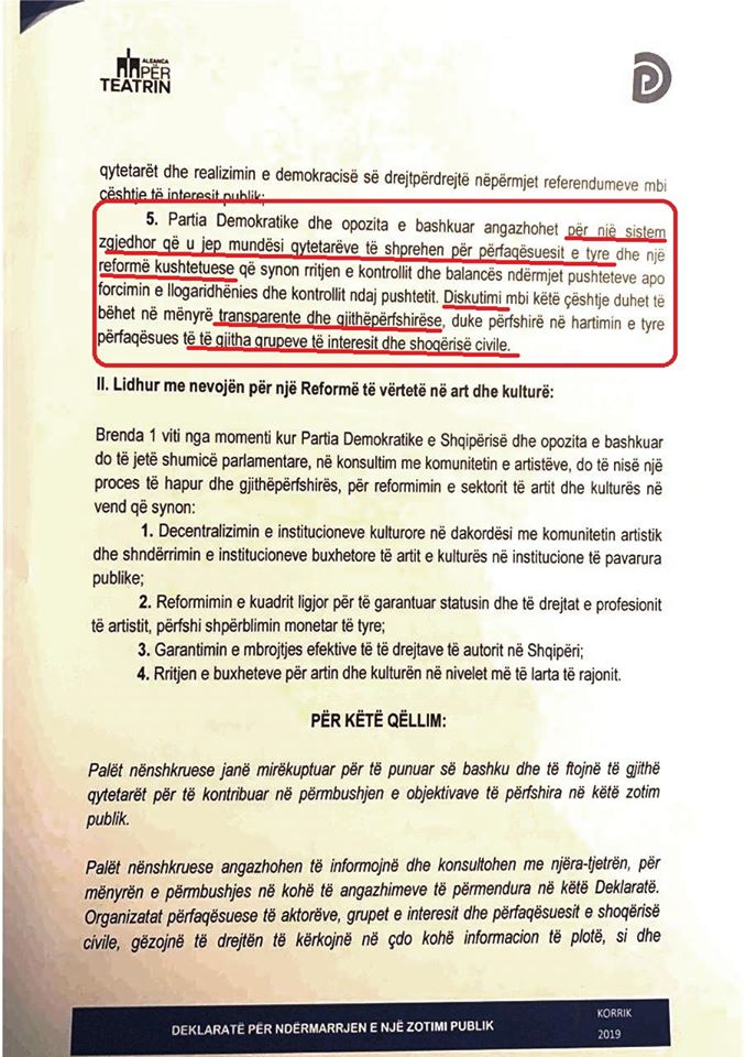 “I nderuar z. Basha, më 25 korrik 2019, ne, anëtarët e Aleancës për Mbrojtjen e Teatrit (AMT), kemi nënshkruar një kontratë me ju, si kryetar i PD dhe Opozitës së Bashkuar. Në paragrafin 5 të kësaj kontrate shkruhet: “Partia Demokratike angazhohet për një sistem zgjedhor, që u jep mundësi qytetarëve të shprehen për përfaqësuesit e tyre dhe një reformë kushtetuese, që synon rritjen e kontrollit dhe balancës ndërmjet pushteteve apo forcimin e llogaridhënies dhe kontrollit ndaj pushtetit…”, i kujton Aleanca, Bashës.