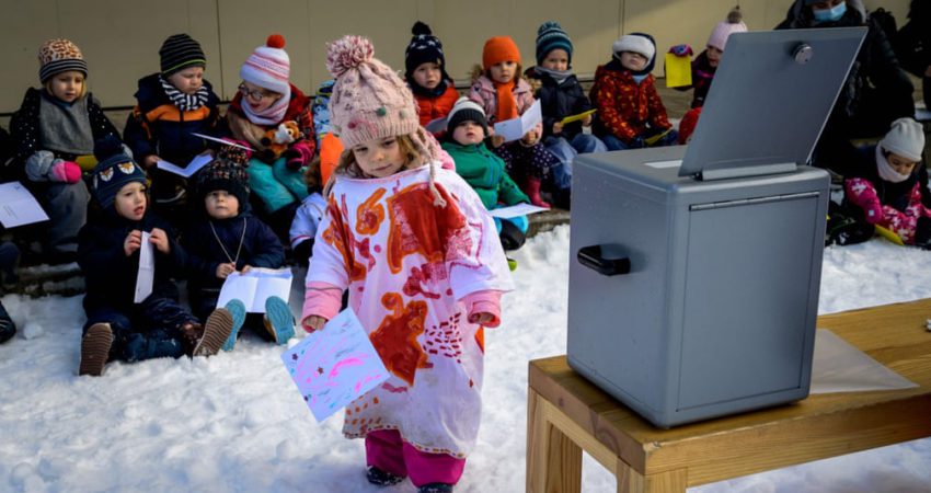 Në Zvicër, fëmijët parashkollorë mësojnë se si të përdorin një kuti votimi gjatë një mësimi të krijuar për të njohur fëmijët e vegjël me sistemin dhe politikat.