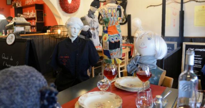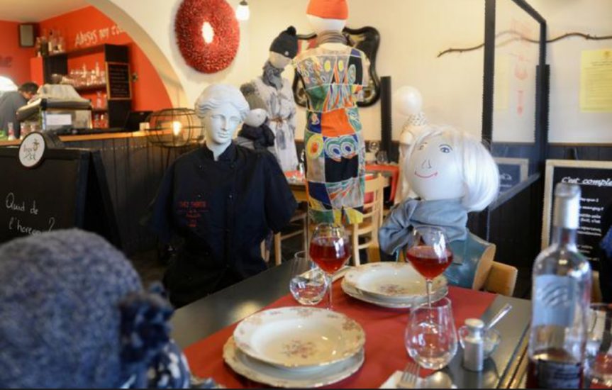 Therese Mahieu filloi t’u shërbejë gota verë të kuqe manekinëve me paruke, kapele dhe shalle, të ulur në bar.