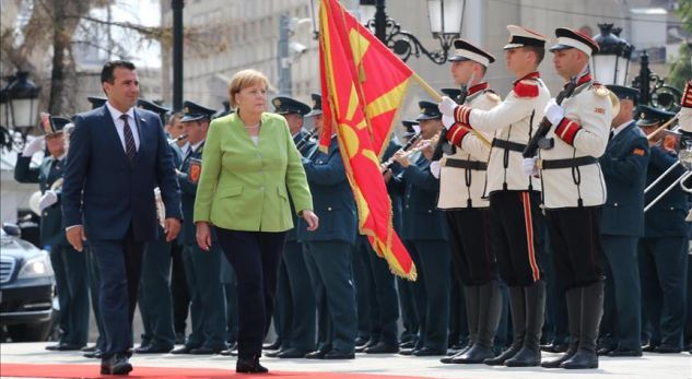 Kancelarja gjermane, Angela Merkel, u prit ditën e sotme me një ceremoni solemne nga kryeministri Zoran Zaev. Merkel është kancelarja e parë gjermane që viziton Maqedoninë, pas vizitës së shkurtër të kancelarit Gerhard Shroeder në vitin 1999, për shkak të krizës në Kosovë.
