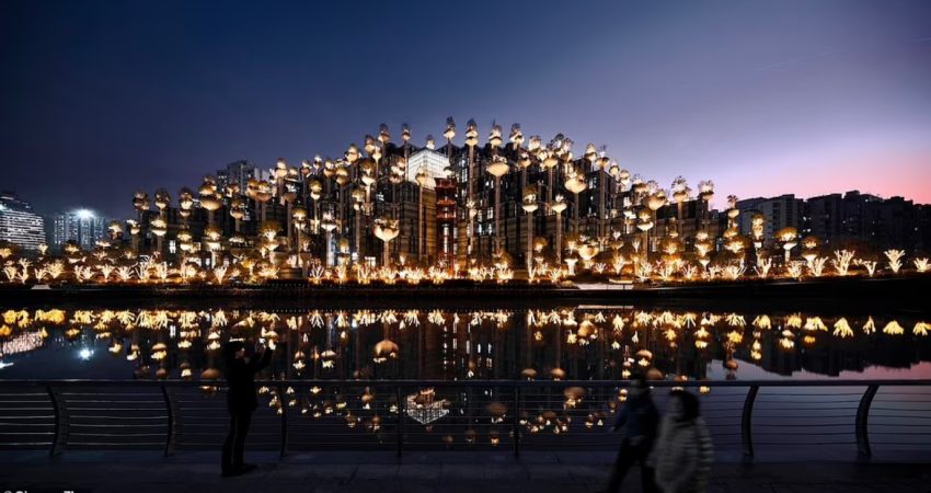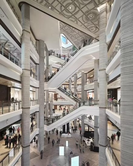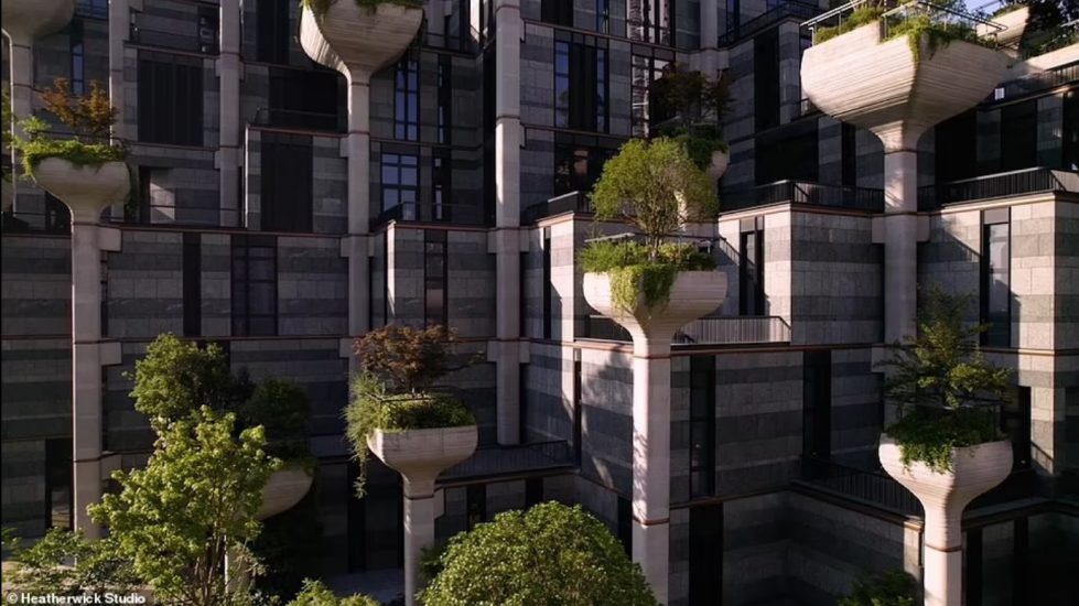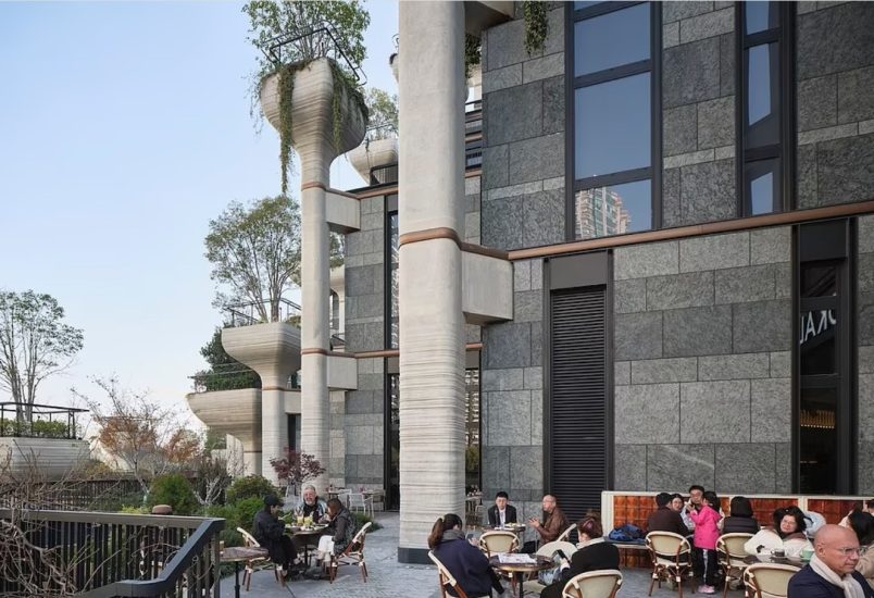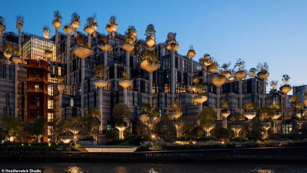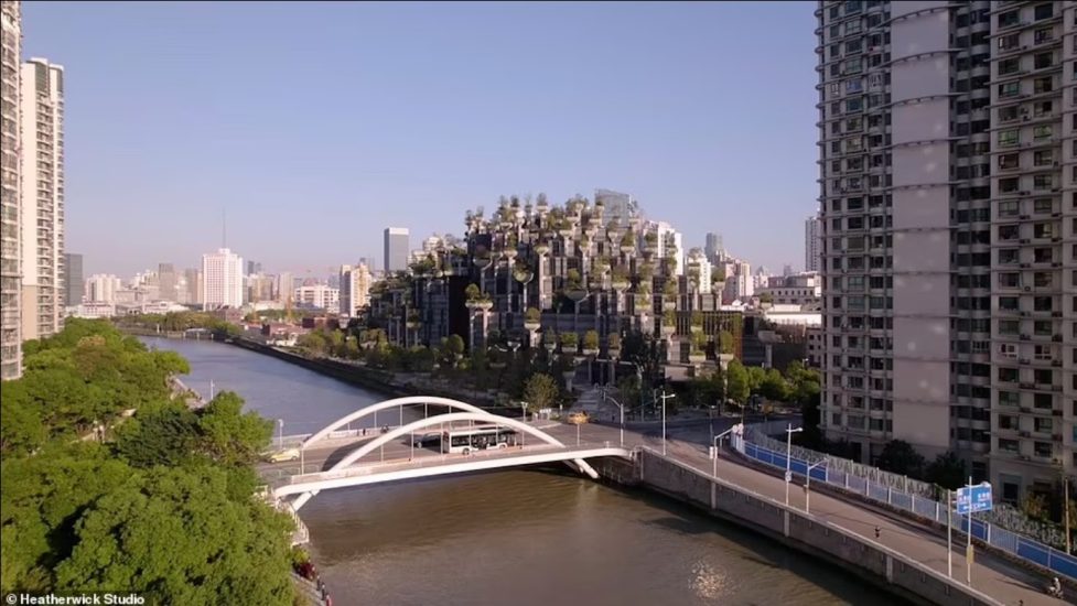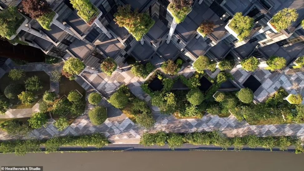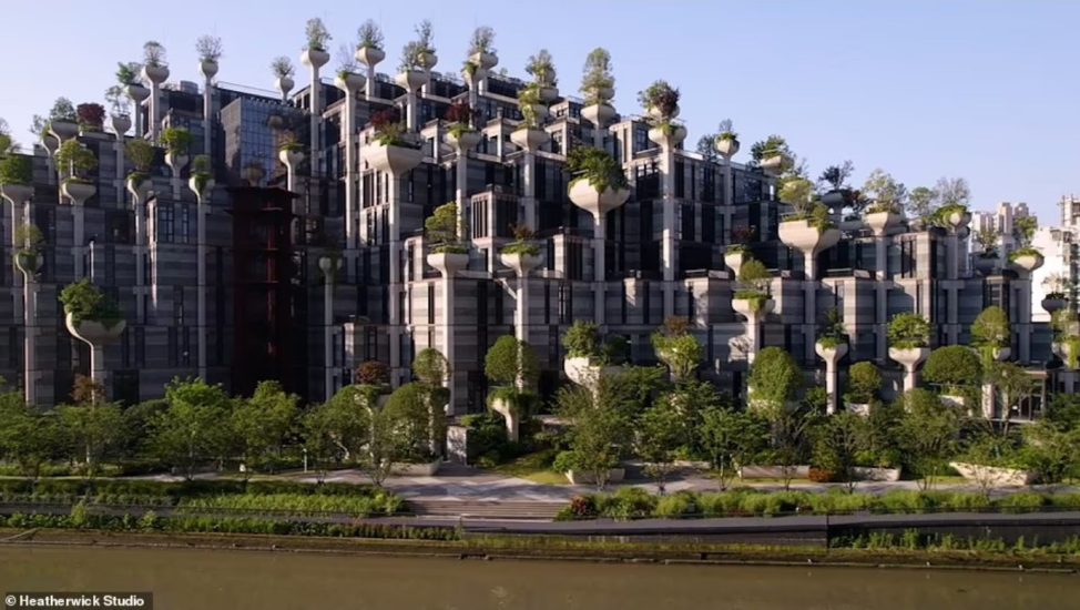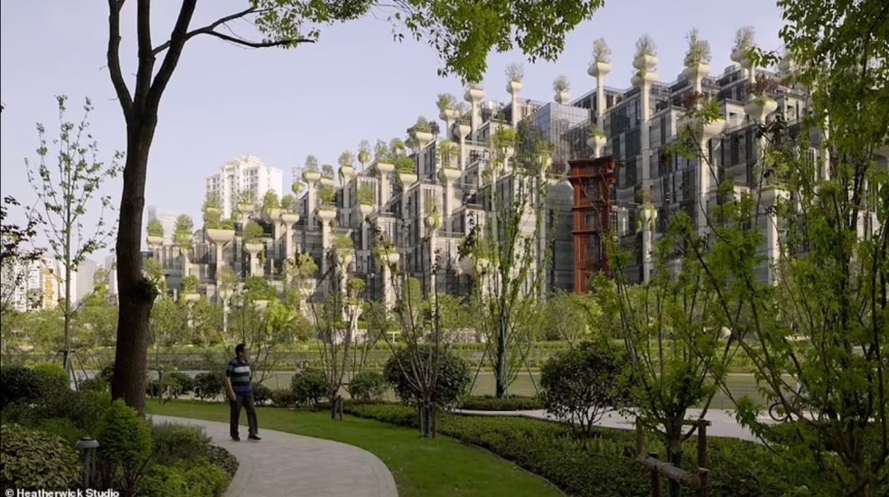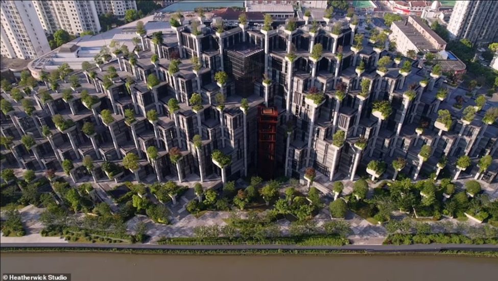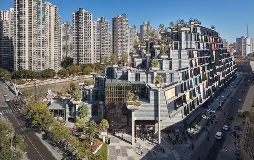 Ndërtesa madhështore “1000 Pemë”, e vendosur përgjatë përroit Suzhou në Shangai, Kinë, është krahasuar me “Kopshtet e varura të Babilonisë” falë fasadës së saj të bimëve të ndriçuara të varura dhe në këmbë.
