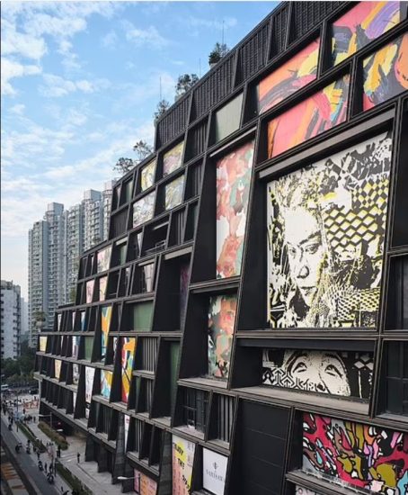 Fasada jugore e ndërtesës, e cila përballet me zonën e artit M50 të Shangait, u zbukurua nga 16 artistë vendas dhe ndërkombëtarë.