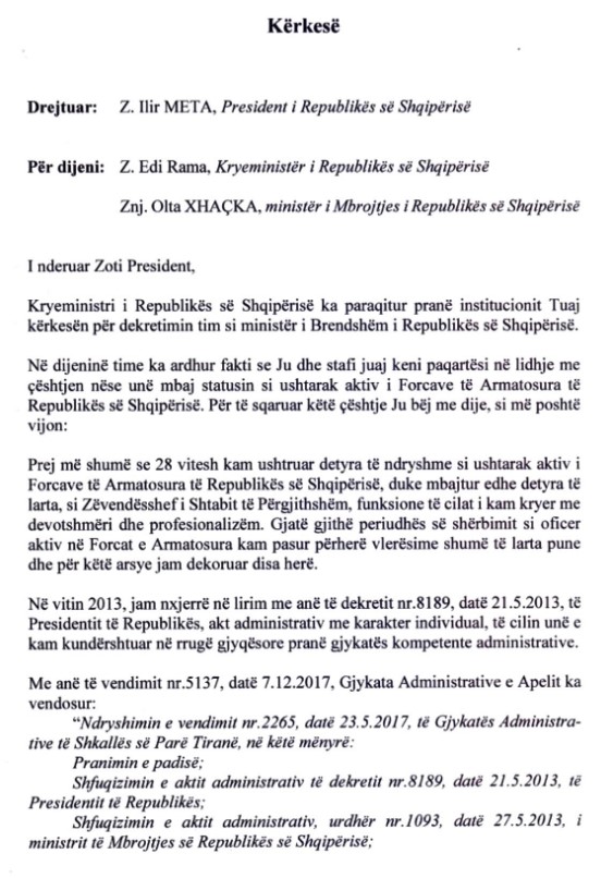 Kryeministri Edi Rama ka publikuar letrën e ministrit të Brendshëm të komanduar, Sandër Lleshi, drejtuar presidentit Ilir Meta.
