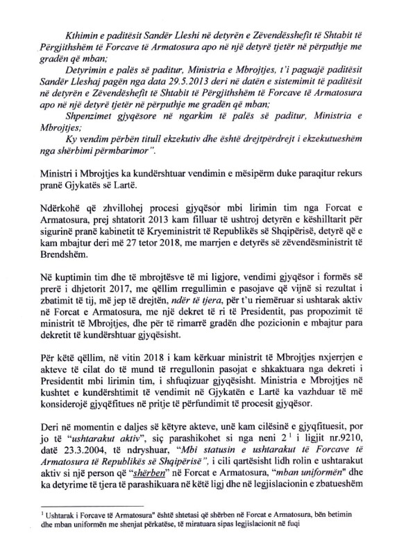 Në letrën drejtuar Metës, Lleshi saktëson se ai nuk mban statusin e ushtarakut prej vitit 2013, kur u lirua nga detyra e zv/shefit të Shtabit të Ushtrisë.