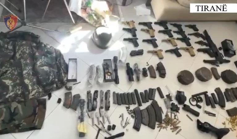 “Sekuestrohet një arsenal armësh i përbërë nga 25 armë zjarri (24 pistoleta dhe 1 kallashnikov), qindra fishekë, lazera që i montohen armëve speciale dhe shërbejnë për qitje në distancë, dhe pajisje optike.  Sekuestohen dhe veshje kamuflazhi si ato të forcave speciale, 4 automjete, 8 celularë, karta SIM, 2 laptopë dhe 2 armë të ftohta (thika)”, tha policia.