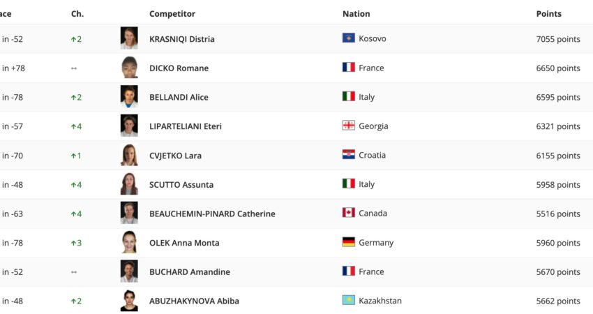 Xhudistja dardane Distria Krasniqi ngjiti dy vende duke u bërë numri 1 në klasifikimin botëror për femra, në të gjitha kategoritë. Krasniqi që garon në peshën 52 kg, ka një total prej 7055 pikësh, 405 më shumë se vendi i dytë ku qëndron francezja Dicko Romane. Më herët Krasniqi ishte numri 3 në Botë. Në karrierën e saj, ajo nuk është renditur asnjëherë jashtë podiumit. Ndërsa u shpall kampione olimpike në vitin 2020, nënkampione e Botës këtë vit dhe 3 herë kampione e Evropës në vitet 2021, 2024 dhe 2025.