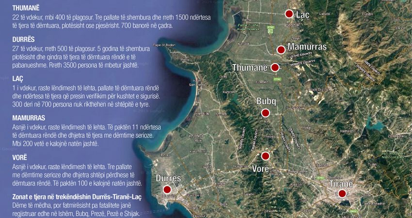 Qeveria thotë se të paktën 4 mijë banorë në trekëndëshin Tiranë-Durrës-Lacc janë aktualisht pa shtëpi. Epiqendra e emergjencës është Durrësi, ndërkohë që në Thumani operacionet e kërkim-shpëtimit kanë përfunduar.