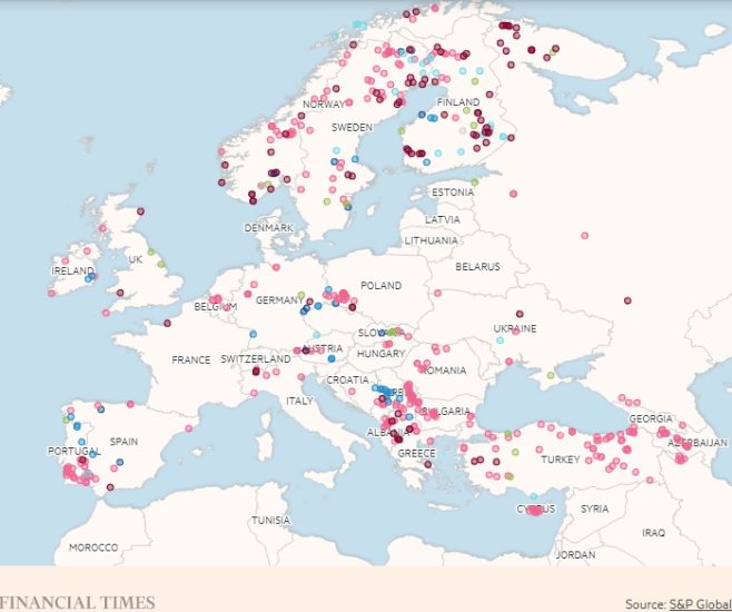 Harta e S&P Global për minierat në Europë, tregon një grumbull të përqendruar në pjesët qendrore të gadishullit ballkanik. Ato shtrihen në Serbi, Kosovë, Shqipëri, Maqedoni e Veriut dhe në perëndim të Bullgarisë.