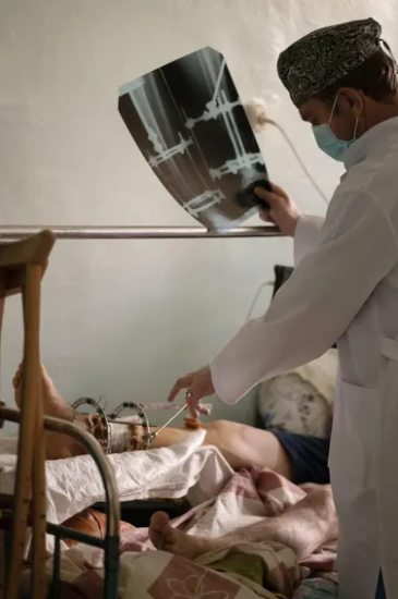 Një mjek që kujdeset për një pacient që ka një aparat Ilizarov, i cili është përdorur në procedurat më të hershme moderne të zgjatjes së gjymtyrëve.