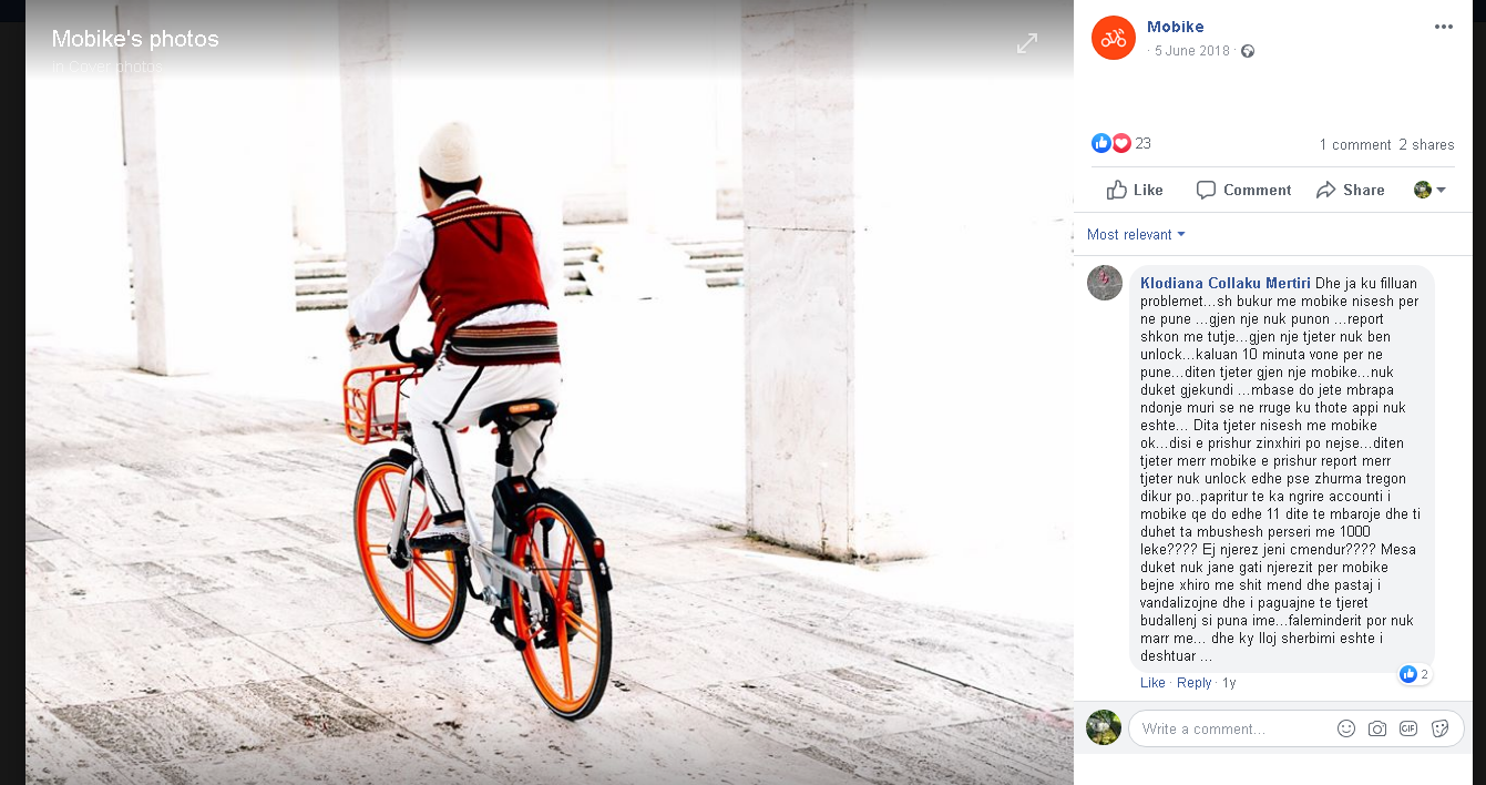 Kurse klientë të tjerë të kompanisë, përdorues të biçikletave “Mobike” në Tiranë kanë humbur lekë nga paketat e blera. Disa syresh thonë për Gazetën “Si”, se i kanë shkruar kompanisë e-mail për të pyetur nëse do të rimbursohen, por nuk kanë marrë përgjigje dhe tashmë i konsiderojnë lekët e tyre të humbura. Më poshtë po ju sjellim vetëm disa prej komenteve negative të përdoruesve të “Mobike”: