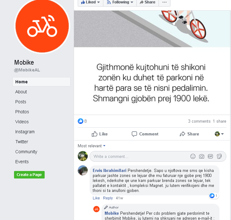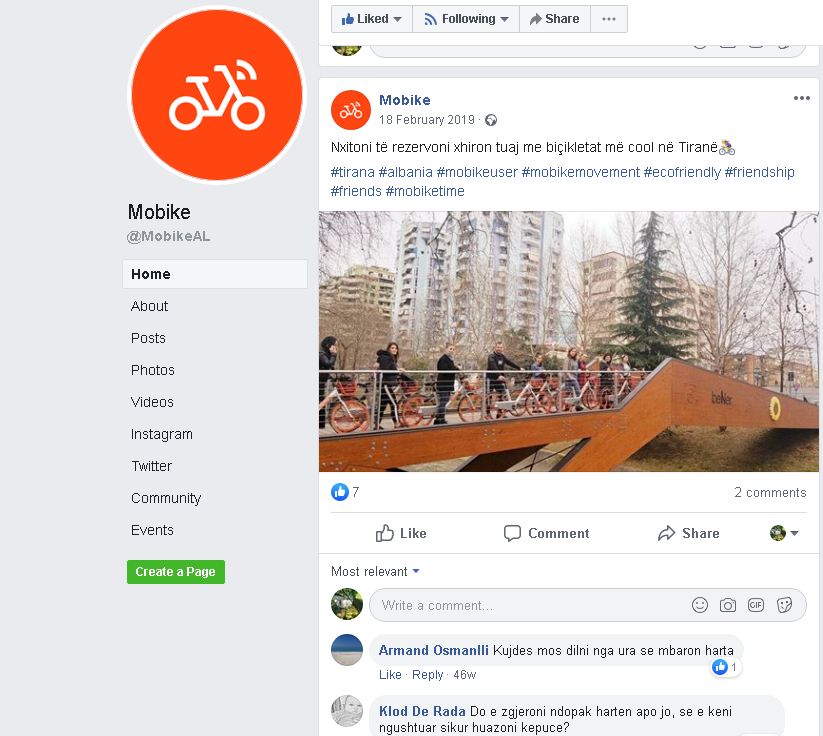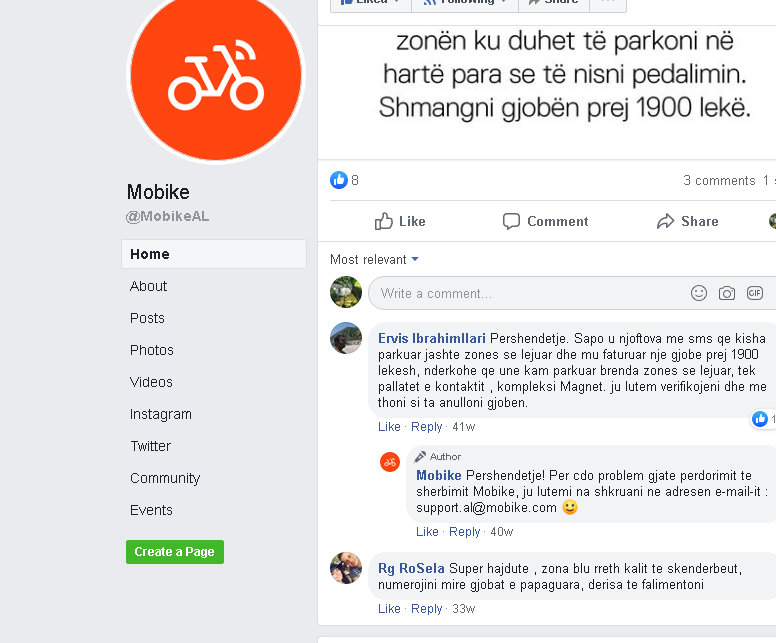 Llogaria në Facebook e “Mobike” në Shqipëri nuk është rifreskuar që në korrik 2019.