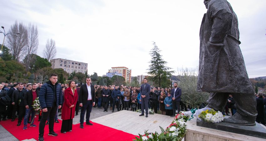 Deputetja e PD, Rudina Hajdari, duke folur gjatë një ceremonie tek shtatorja e Azem Hajdarit në Qytetin Studenti, me rastin e 28-vjetorit të Lëvizjes Studentore të 8 Dhjetorit e shpallur si Dita e Rinisë