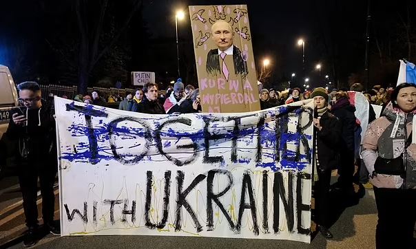 Protestat kundër pushtimit të Putinit në Ukrainë shpërthyen në të gjithë botën dhe madje arritën deri aty sa në Rusi njerëzit po tallen me fotot e presidentit rus që duket si Adolf Hitler.
