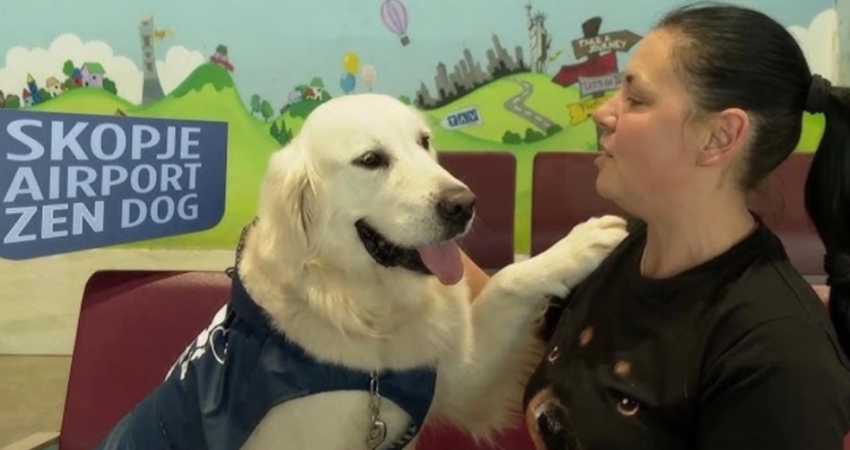 Udhëtarët nervozë në Aeroportin e Shkupit, të cilët janë në ankth dhe nuk ndihen të gatshëm për të udhëtuar me avion, kanë në dispozicion në sallën e nisjeve Dino-n, retriverin e artë, që i ndihmon të relaksohen.