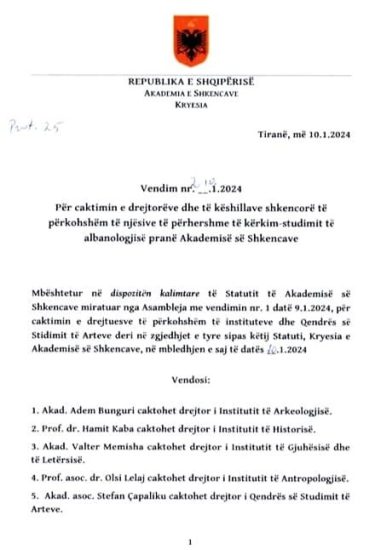 Nga Gazeta ‘Si’– Një ditë pasi miratoi online statutin e ri, Akademia e Shkencave në Shqipëri ka shkarkuar drejtorët e Instituteve Albanologjike që ishin në gjysmën e mandatit dhe ka emëruar të rinj.