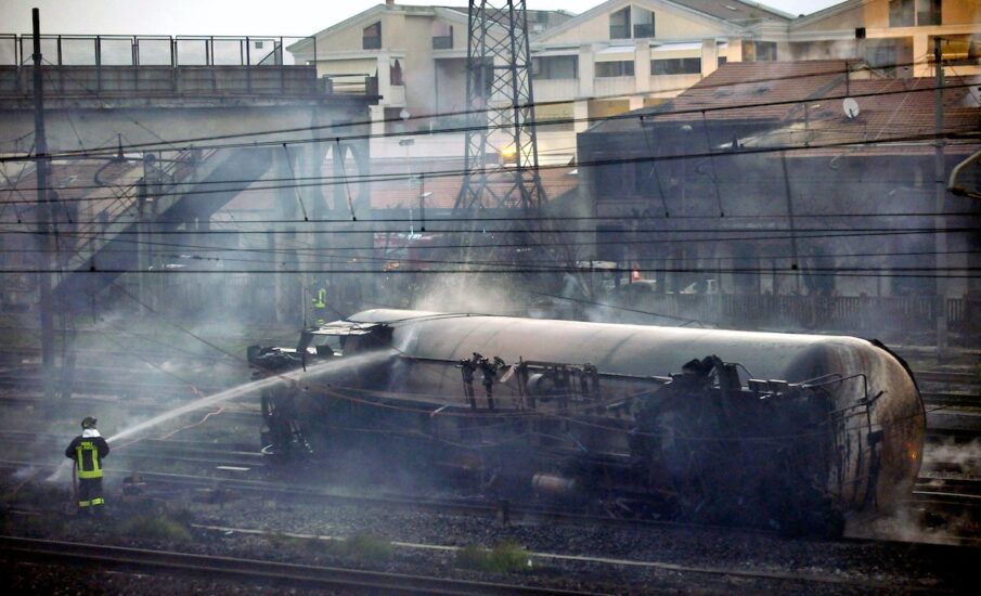 Një zjarrfikës shuan një nga vagonët e cisternës së trenit të dalë nga shinat në Viareggio, Itali, më 30 qershor 2009